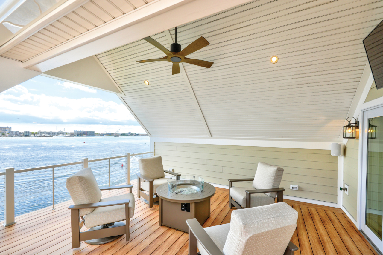 Durable Zuri deck material mimics hardwood and provides a maintenance-free surface for the first-floor deck and upper-deck party platform, which is partly covered and connects to the home office. Each bedroom has a balcony step-out space, so family and guests can enjoy private outdoor views too. As for flooring throughout the home, continuing a mindset of coastal practicality, the Shemanskis chose luxury vinyl plank flooring in sandy tones that speak to a beachy aesthetic.