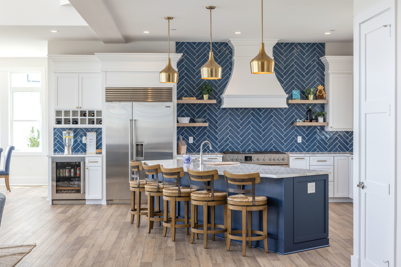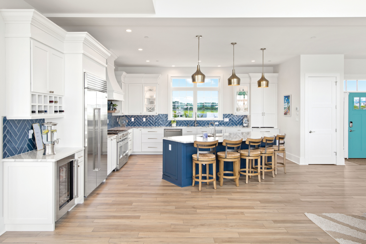 “I gave myself permission to not have all of the blues match because the ocean and sky are not all the same color blue,” Becky related. With that mindset, she selected varying colors of navy, cobalt, baby blue, cerulean and pops of teal that coordinate with the home’s front door and custom garage doors. This theme is carried out in furnishings, such as the breakfast nook’s leather seating, great-room sofa and velvet-covered dining chairs. It’s also on walls, namely the navy-painted ship lapin the office and the kitchen’s sophisticated herringbone backsplash.