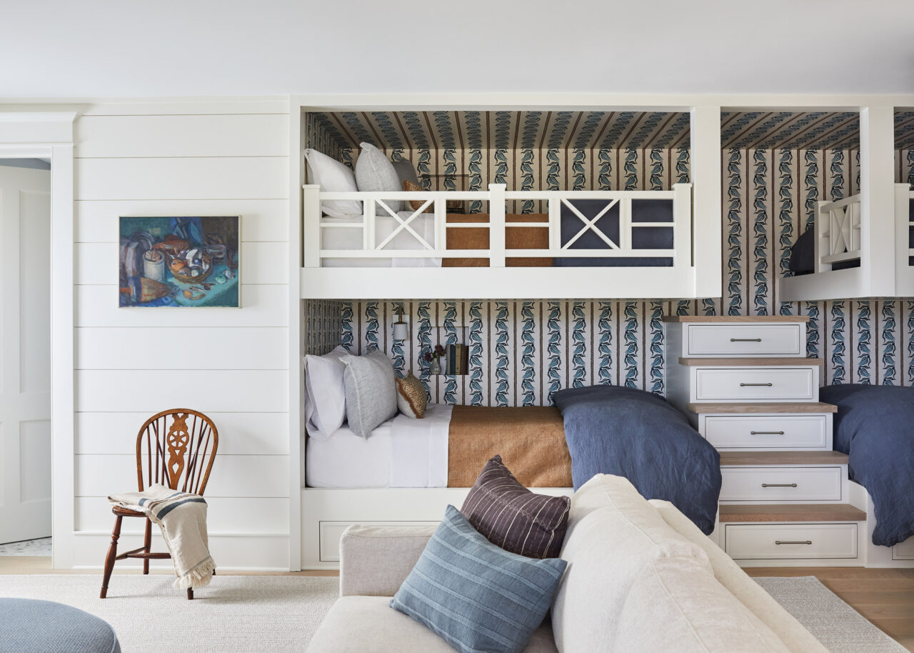 Across the board, each bedroom and bathroom combo has its own character, shaped by tone and texture. Blues create a consistent and gentle coastal ripple effect that intentionally steers off course in treatments such as the bunkroom’s wallcovering by Phillip Jeffries, which incorporates a rust rope-like pattern, inviting a grown-up vibe into a versatile space that suits guests of all ages.