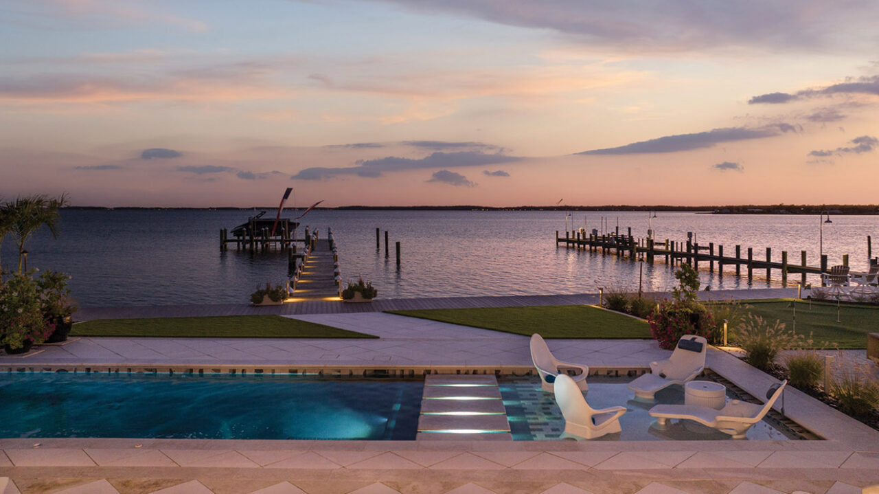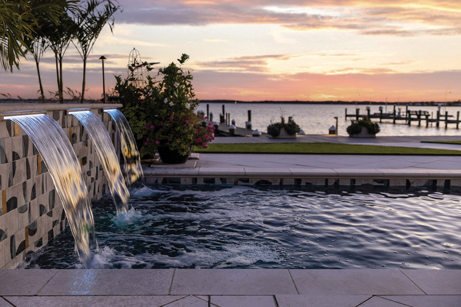 To ensure the pool didn’t compete with the panoramic waterfront, designer Kathleen Mahon used sandblasted Pera Cream marble and an interior finish of Luna Quartz by WetEdge Technologies, finished in its St. Maarten color—selected to mimic the property’s natural surroundings.