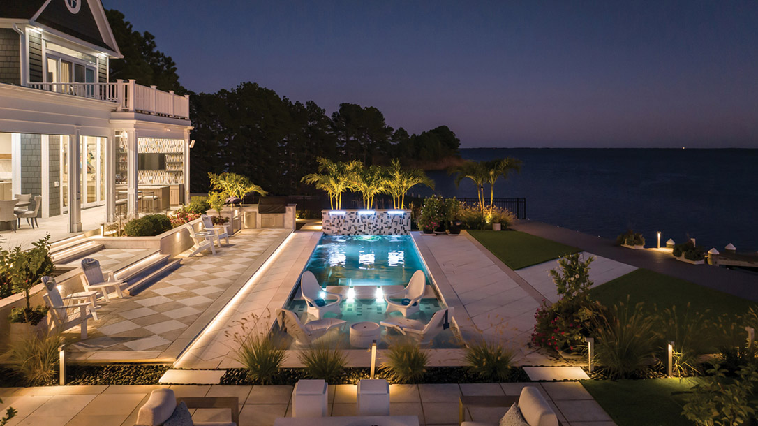 What they created with Carter Aquatics is a layered, detail-driven backyard retreat where materials, light and water quietly do the talking. “This one is special,” says Kathleen Mahon, owner and lead designer at Carter Aquatics in Lewes. “It’s understated, but everything about it is intentional.”