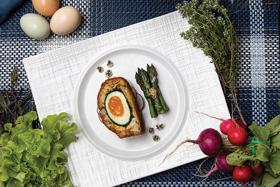 Elevate your Eastern Shore breakfast game with a Scotch Egg & Crab Imperial recipe from Chef Gregory James. Eggs are encased in flavorful spinach, wrapped in crab imperial and coated in breadcrumbs, and cooked to golden perfection. Crispy on the outside and rich on the inside, this classic dish with a Shore twist offers a delightful balance of textures and bold, savory flavors in every bite.